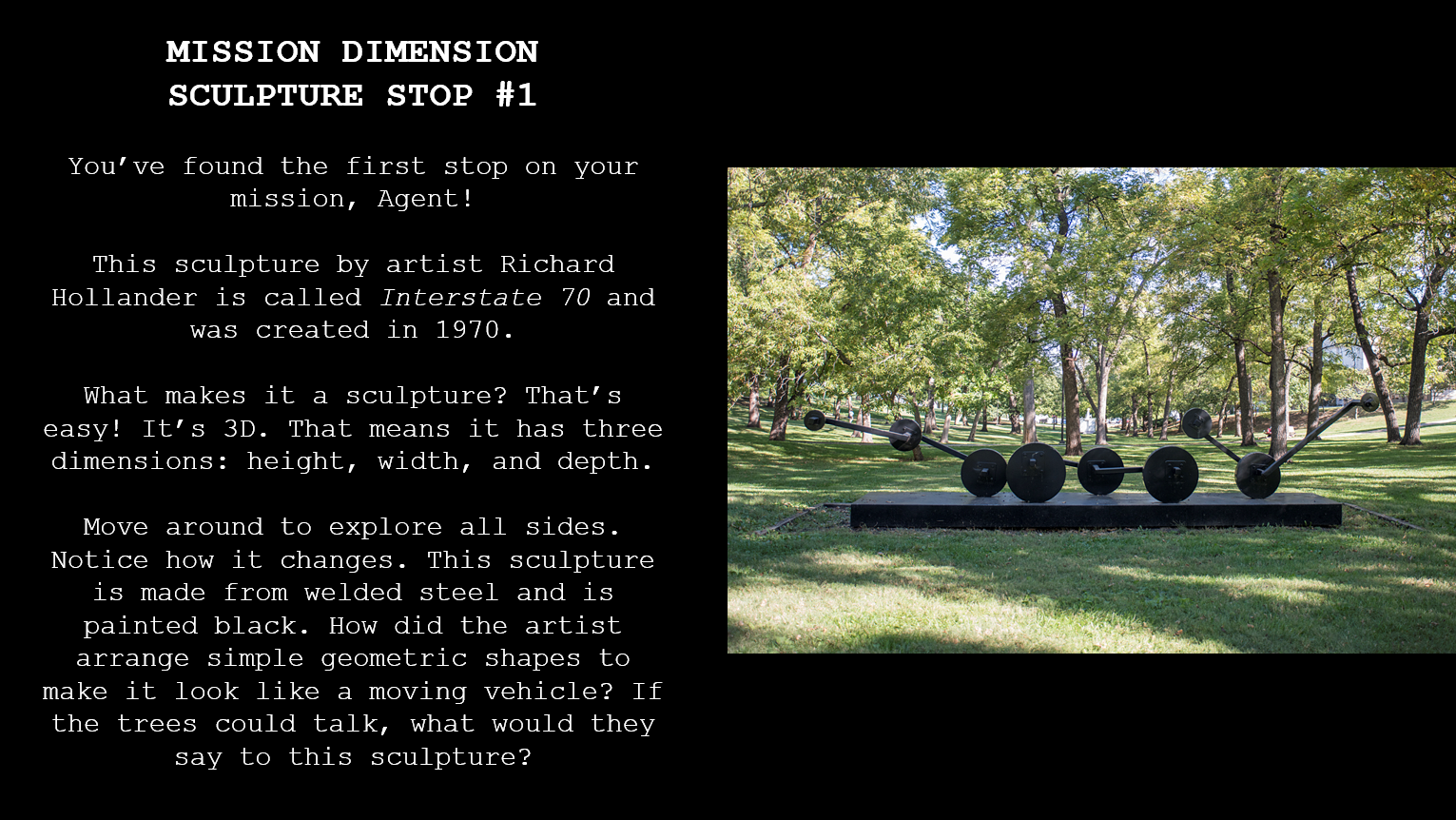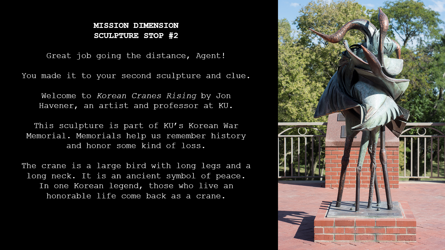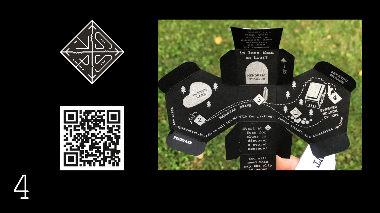 A series of top-secret missions to crack codes, wrestle with riddles, and solve the mysteries of art. Mission Dimension, pictured below, crisscrossed campus to explore four 3-dimensional works of art. Spencer Museum of Art, 2019-2021.