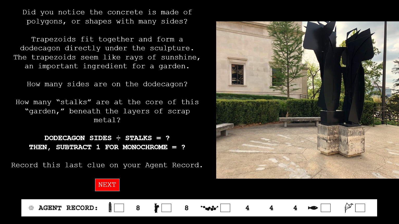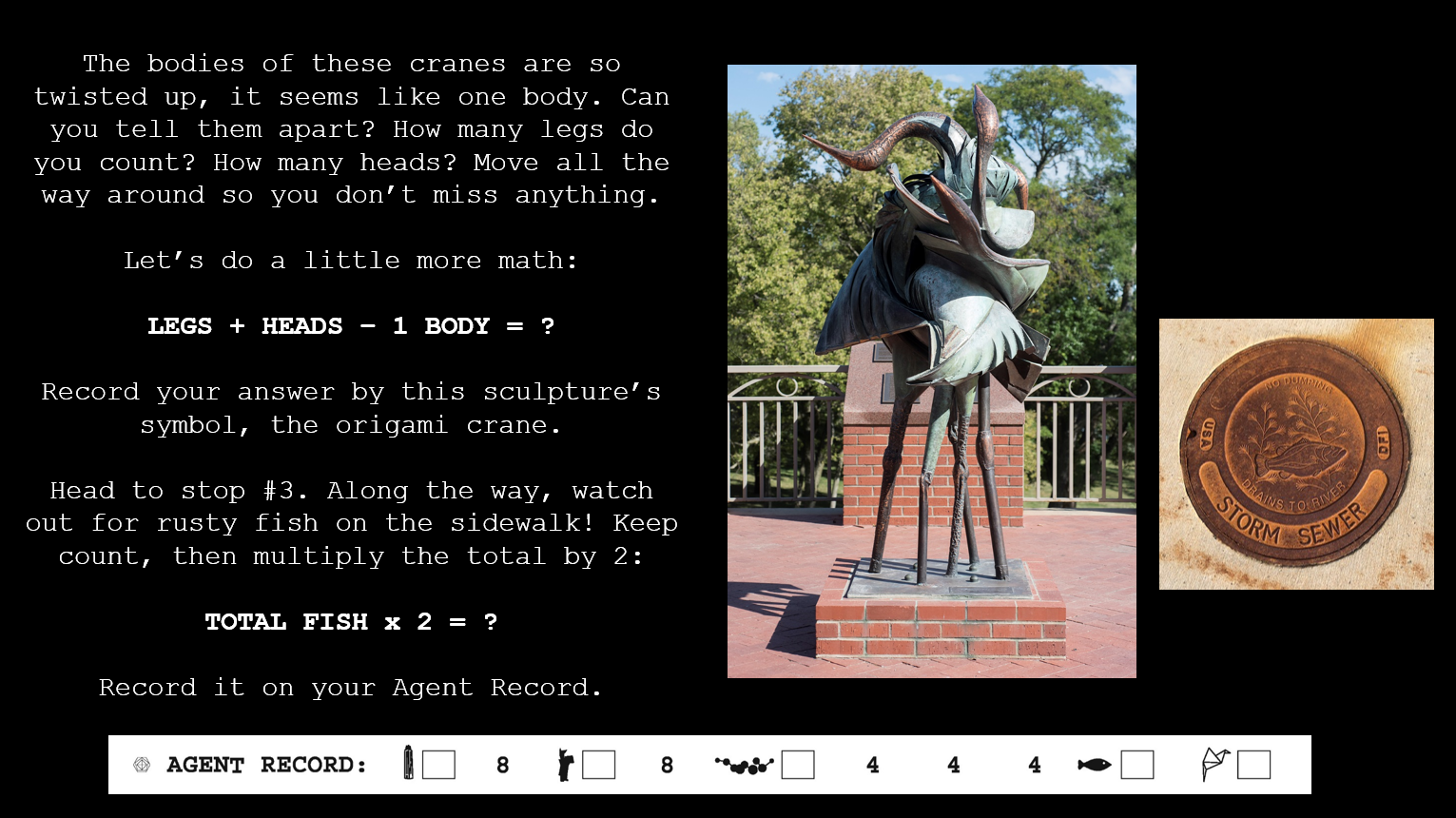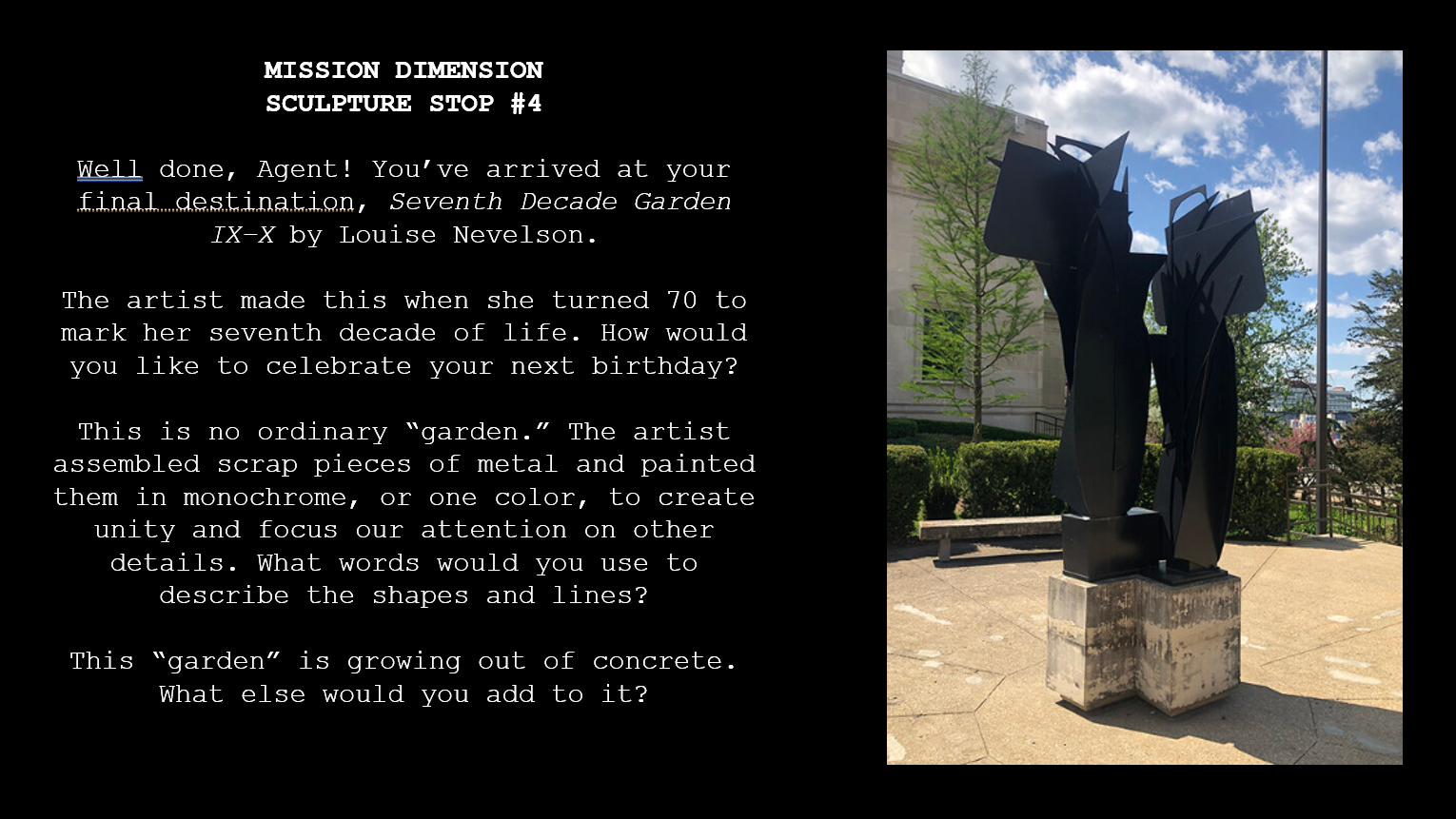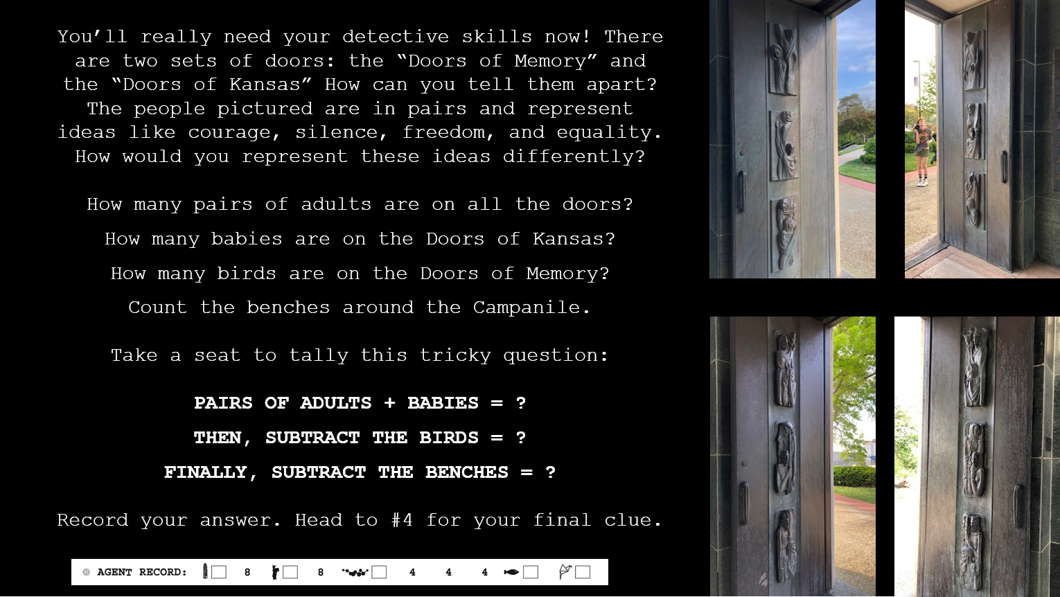 A series of top-secret missions to crack codes, wrestle with riddles, and solve the mysteries of art. Mission Dimension, pictured below, crisscrossed campus to explore four 3-dimensional works of art. Spencer Museum of Art, 2019-2021.