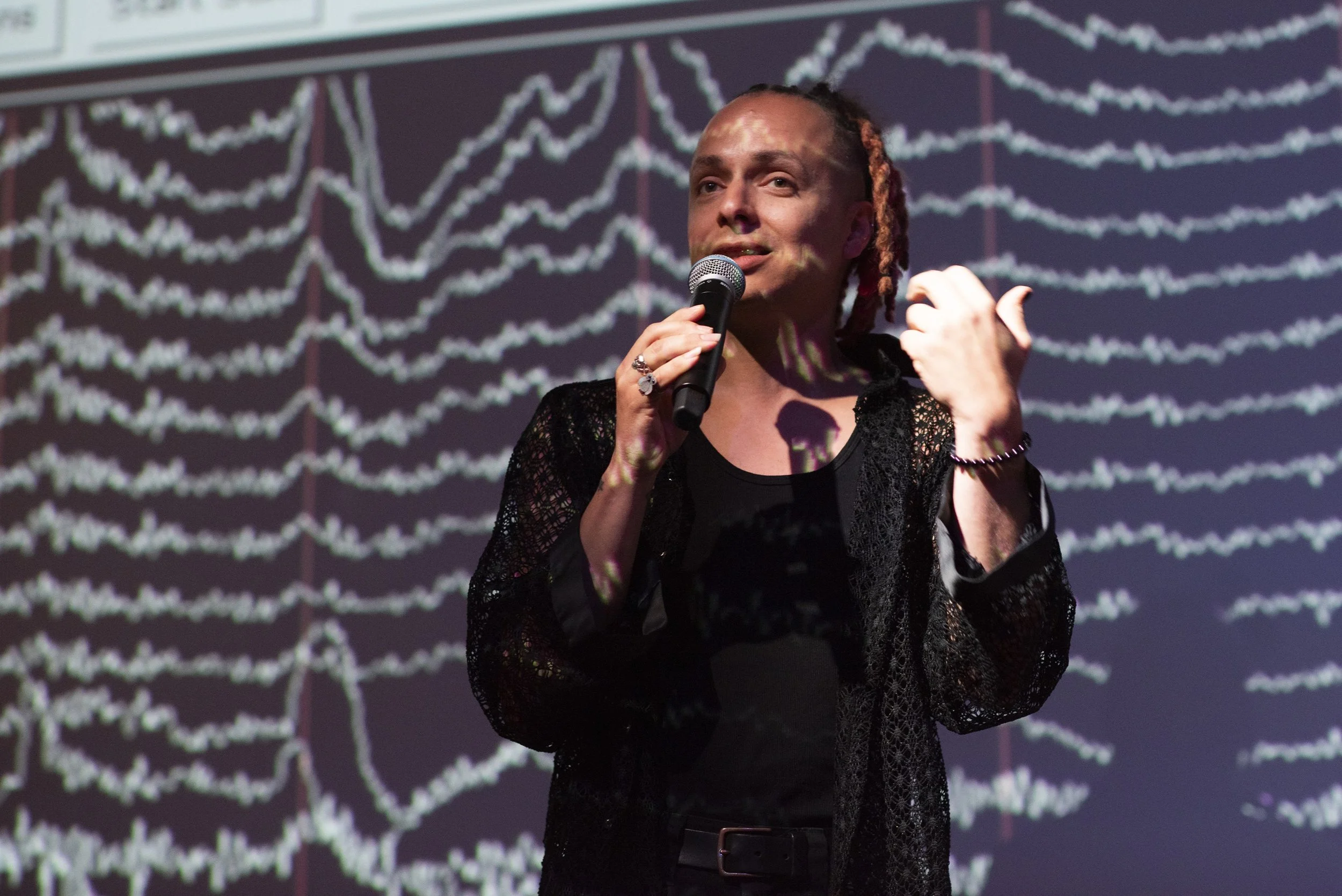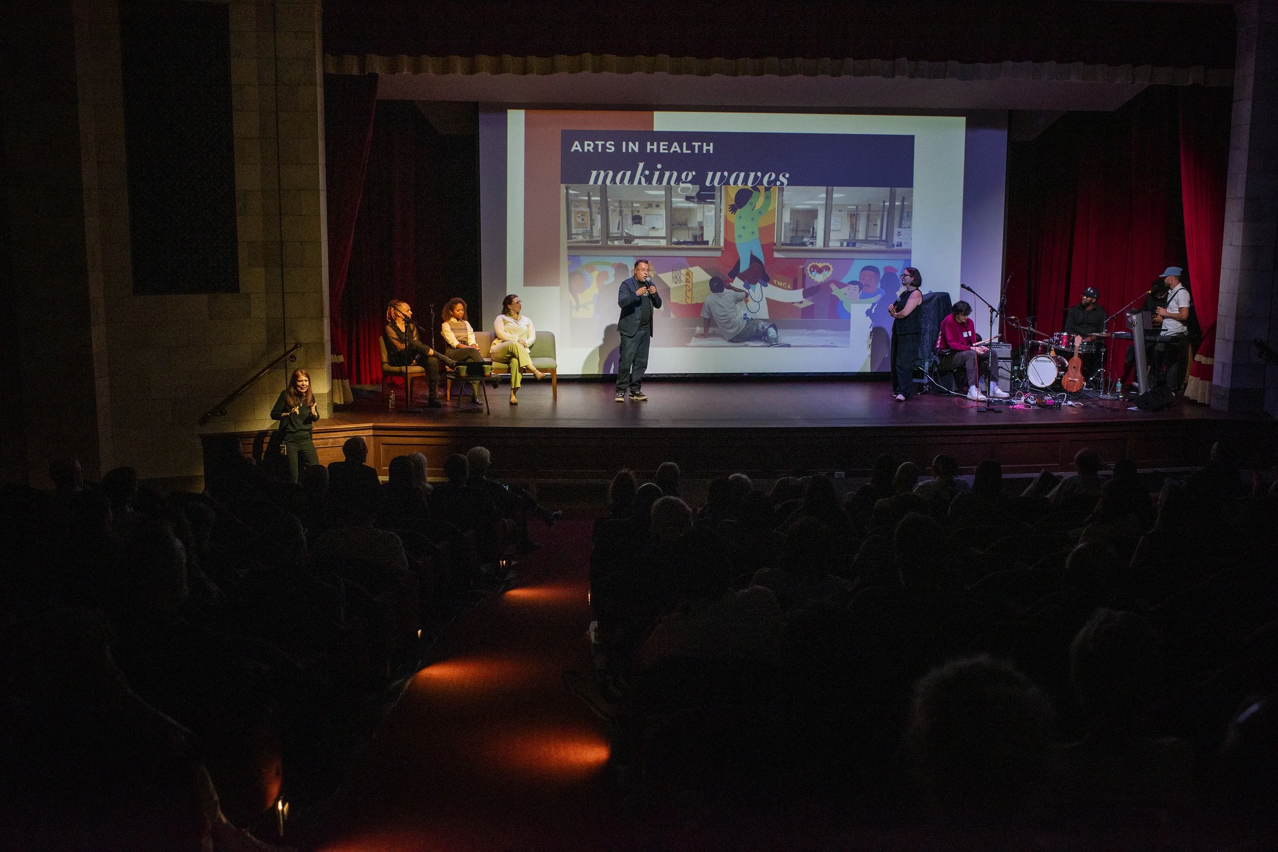 Enrique Chi discusses the brain on art during a live brain scan of musician La Lulu performing at Making Waves: A Deep-Dive on Arts and Health—a series of workshops, a leadership lunch, and Arts Rx Live! multimedia showcase featuring industry innovators and performances | Organized by Art as Mentorship in partnership with The Nelson-Atkins Museum of Art, 2025. | Photo: © Scout Tufankjian