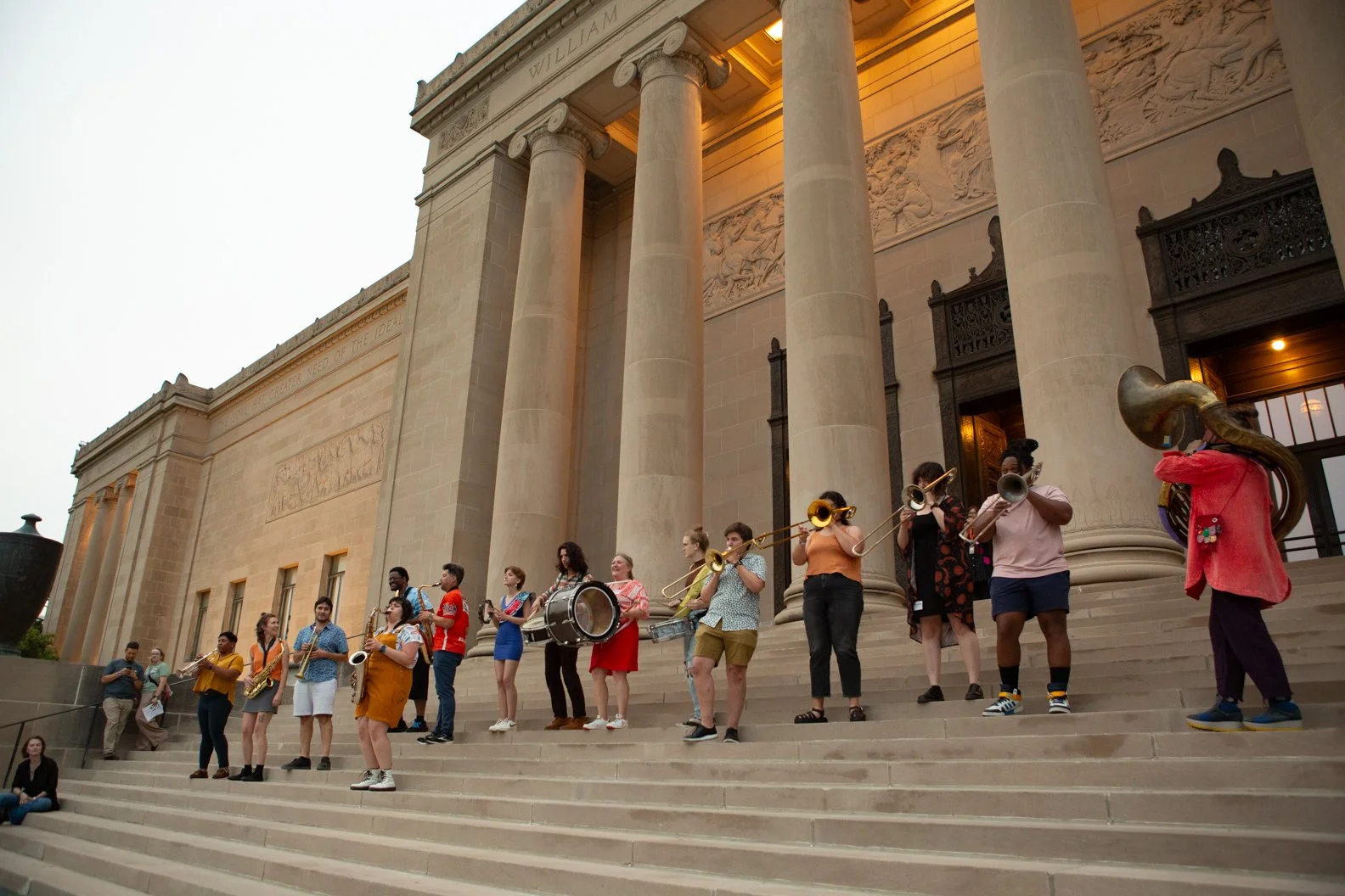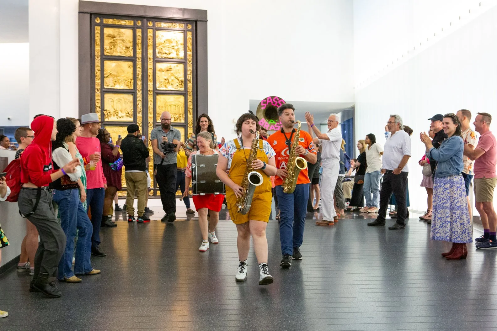 Sass-a-Brass parades through the museum at the inaugural Night/Shift.