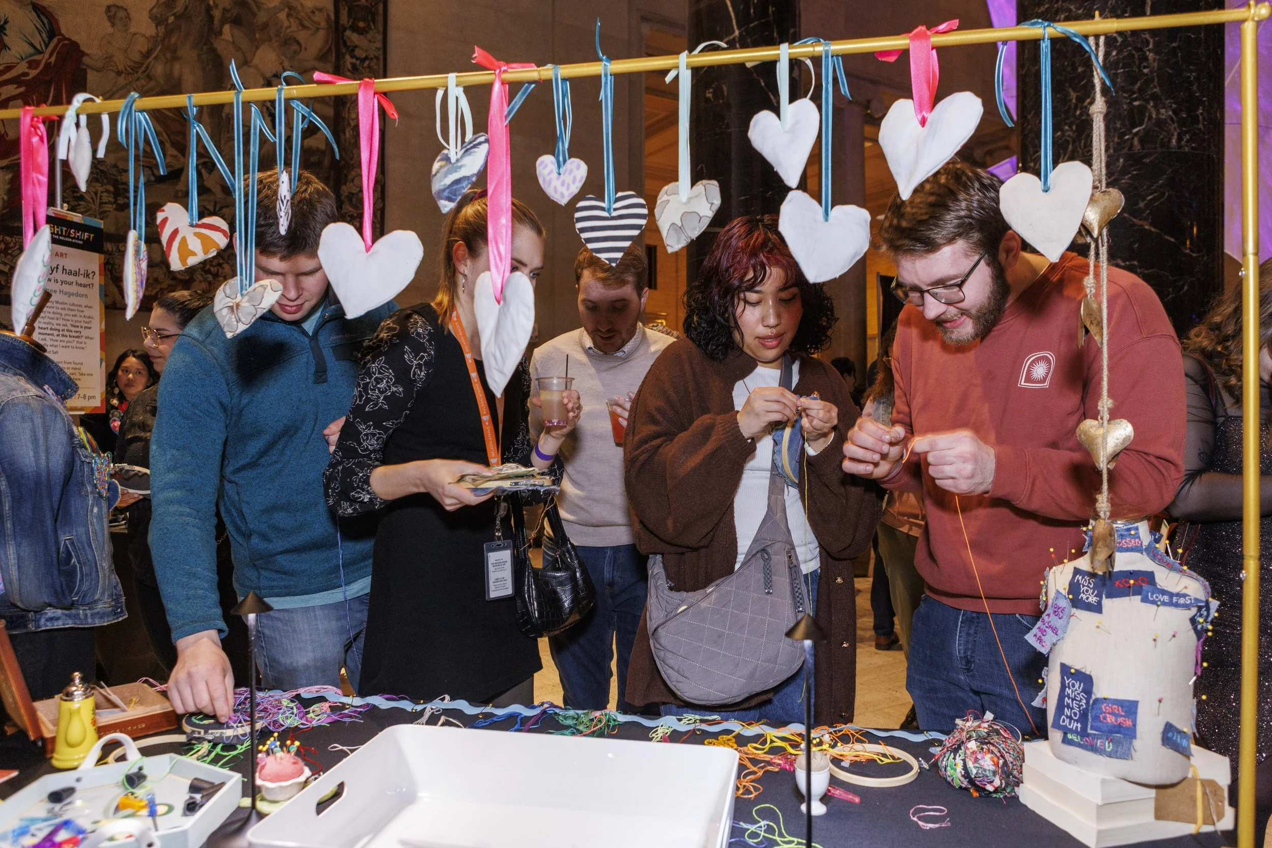 Night/Shift: Star-Crossed | Kayf haal-ik? How is your heart? Inspired by the Arabic greeting to understand the state of one's heart or inner condition, artist Aimee Hagedorn invited guests to stitch a heart from found fabrics, add to or mend someone else's heart, and take one home or leave one for the taking.